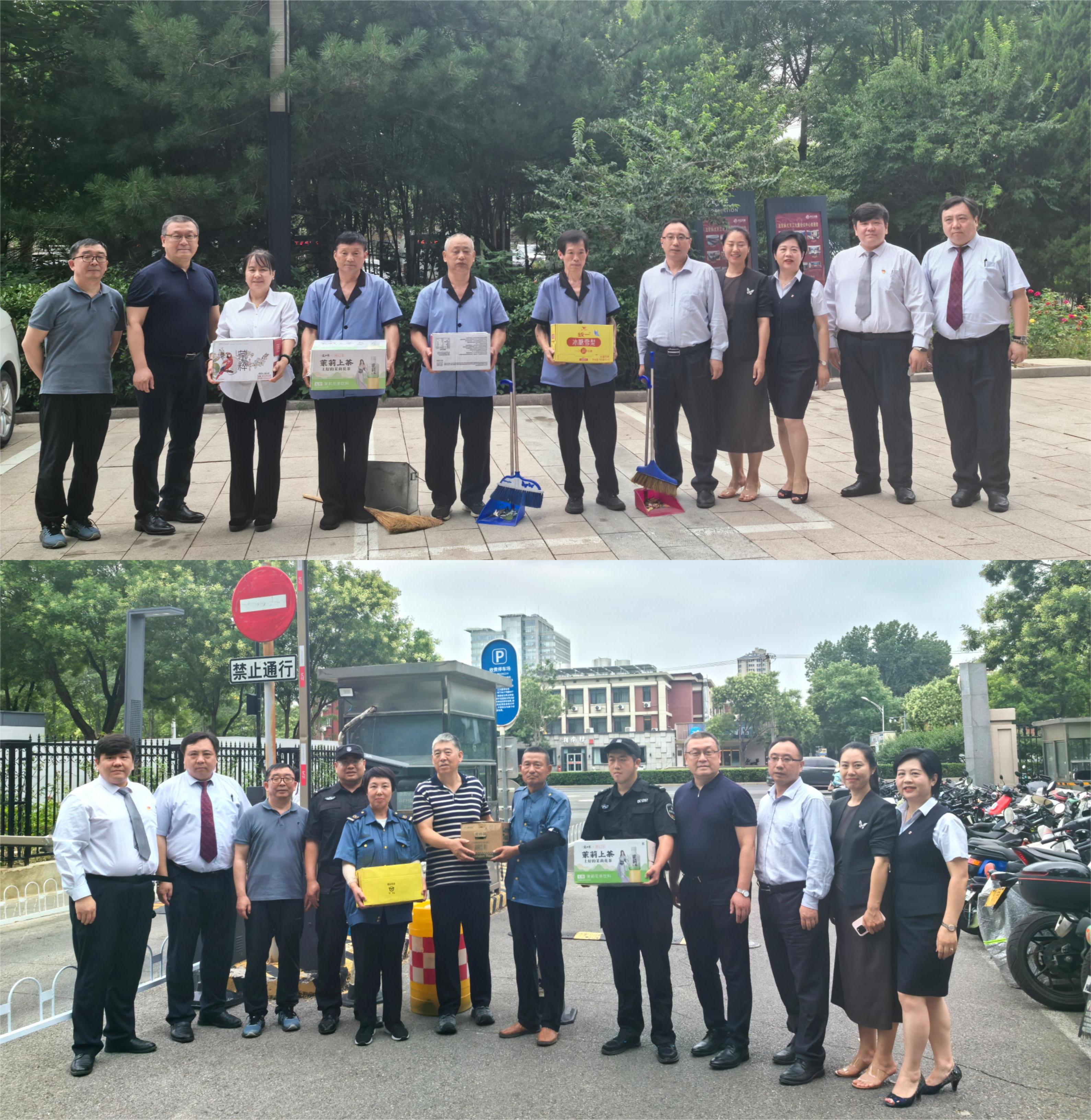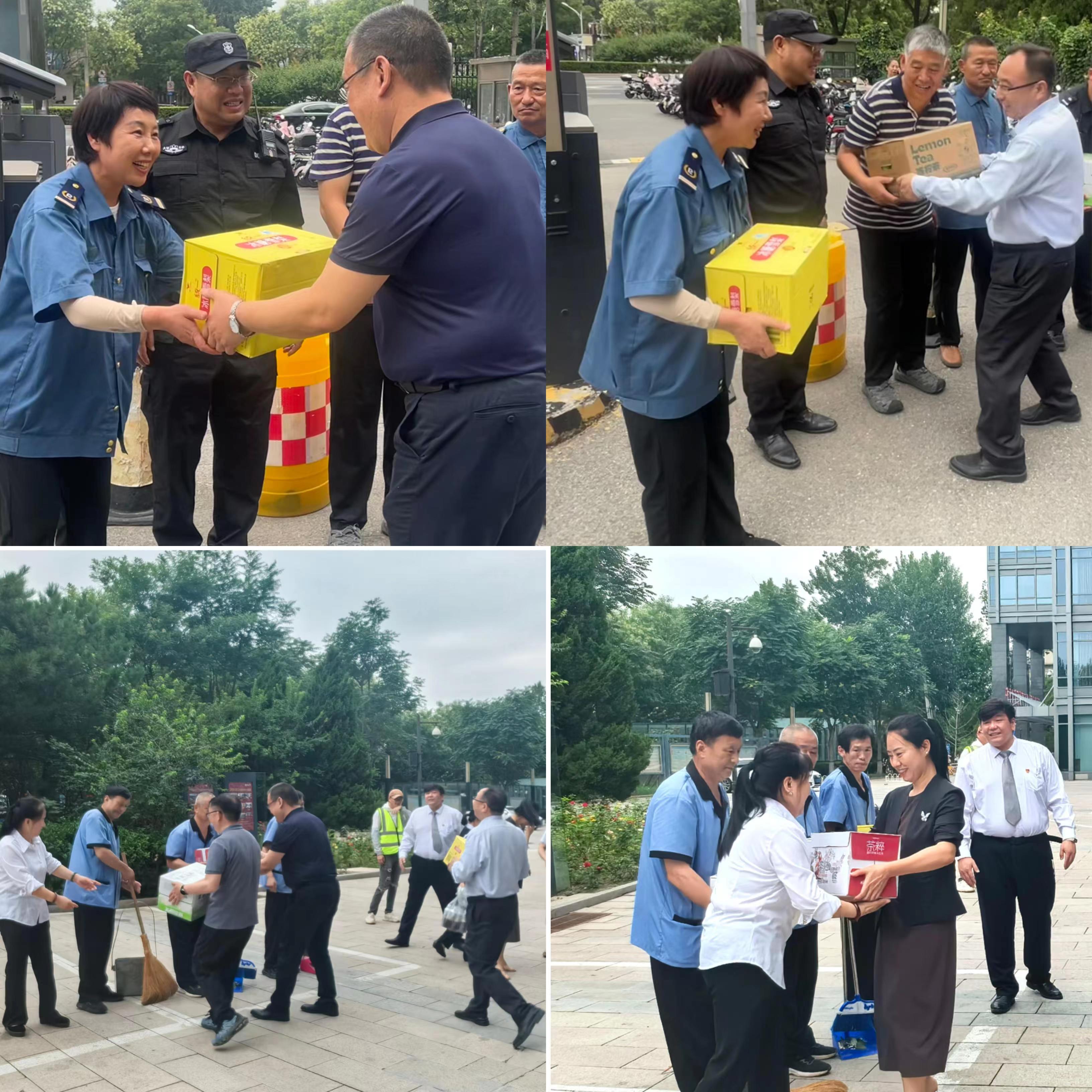 2024年7月22日下午,北京科大天工科技服務有限公司董事長高杰、總經理陳興禹率隊深入一線,開展夏日送清涼活動。他們為高溫下堅守崗位的保安、保潔、車場管理及綠化員工送去了防暑降溫飲料,表達深切關懷。