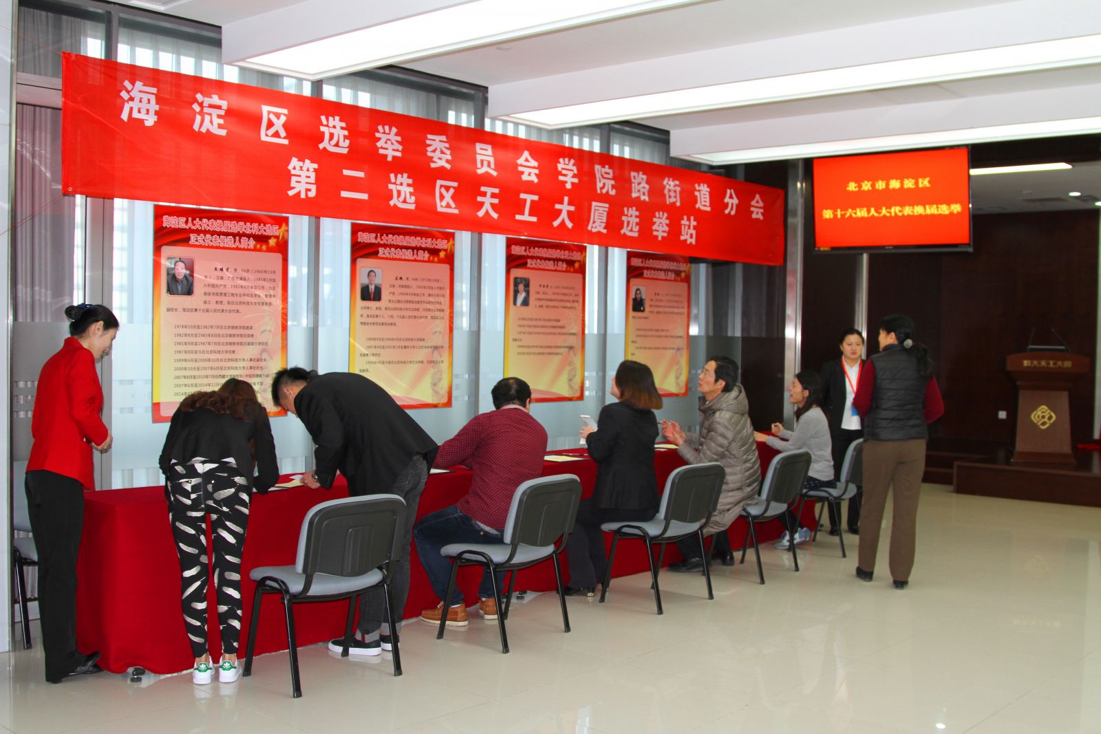 2016年11月15日是北京市海淀區(qū)第十六屆人大代表?yè)Q屆選舉投票日,天工大廈投票活動(dòng)在三層第六會(huì)議室進(jìn)行,早上8點(diǎn)鐘,天工選舉工作小組全體成員到位,做好投票前的一切準(zhǔn)備工作。8點(diǎn)30分正式開(kāi)始投票,工作人員對(duì)選民進(jìn)行核驗(yàn)檢查,每發(fā)一張選票就在選民證上蓋上一個(gè)“已選”章,監(jiān)票人認(rèn)真履行檢票職責(zé),安保人員組織現(xiàn)場(chǎng)選民有序排隊(duì)。選民在寫(xiě)票處詳細(xì)觀看了4位代表候選人的基本情況,在選票上認(rèn)真填寫(xiě),積極行使《憲法》和《選舉法》賦予的權(quán)利,在莊嚴(yán)的五星紅旗下,投下了神圣的一票,因公出差在外而無(wú)法當(dāng)天返回的部分選民也委托他人進(jìn)行了投票。天工大廈選舉站發(fā)出選票133張,收回選票133張,投票率100%。